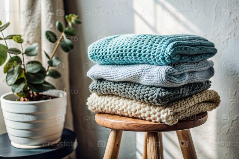 Близко. Вязала теплую одежду на деревянном стуле в комнате. Зимний сезон, малый бизнес, одежда ручной работы