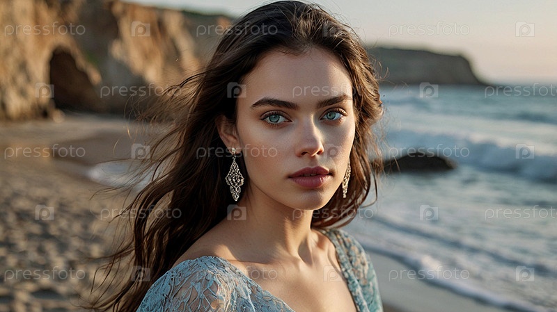Портрет красивой женщины на пляже на фоне моря. Романтическая, спокойная и чувственная фотография девушки в воздушном нежном платье