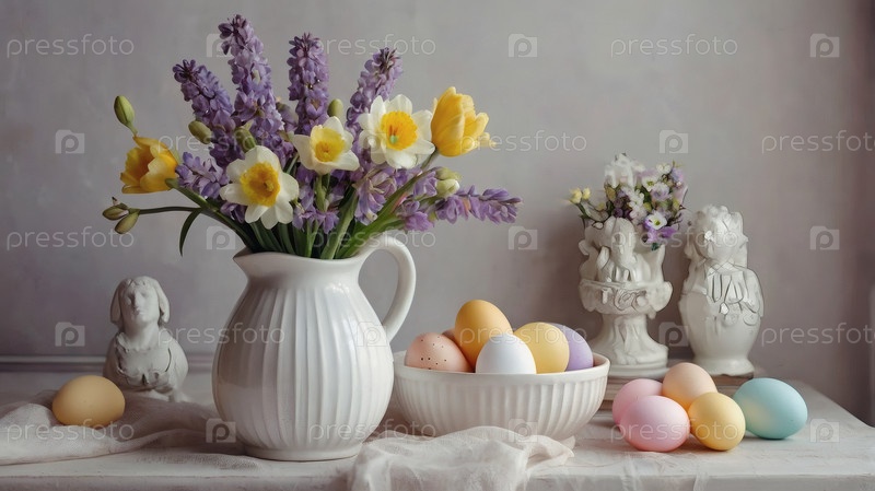 Концепция яркого пасхального праздника. Ретро интерьер дома с пасхальным декором. Весенние цветы в белой вазе и пасхальные яйца в пастельных оттенках