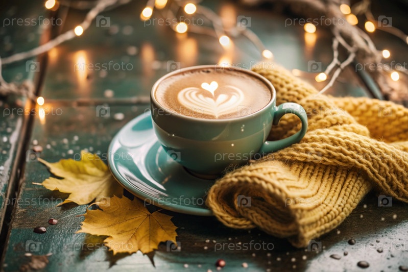 Сезонный напиток. Вкусное горячее капучино в кружке с блюдцем и вязаной канавкой, шарф на деревянном столе в интерьере кафе. Дождливый осенний день