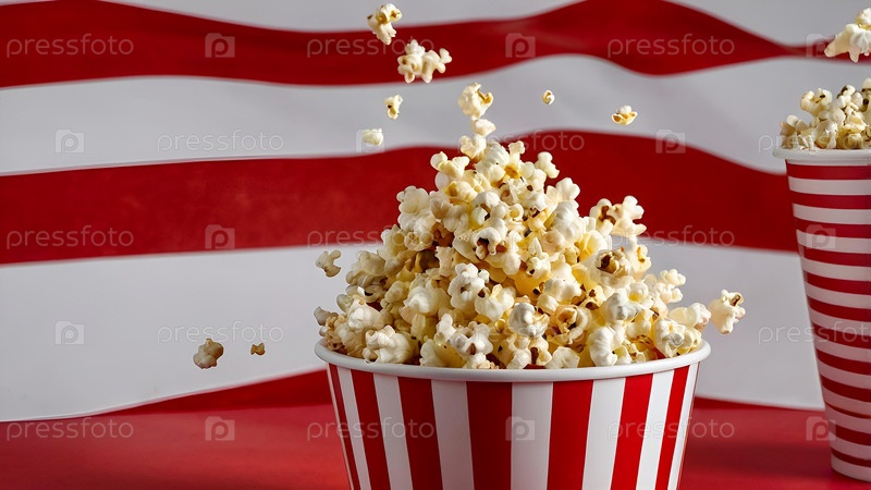 Полосатый красно-белый ящик с соленым попкорном. Популярная закуска в кино