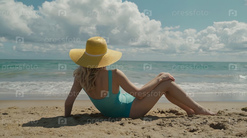 Женщина на отдыхе, сидящая в купальнике и широкополой соломенной шляпе на пляже в солнечный день и глядящая на море