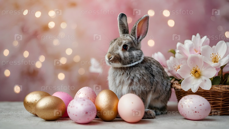 Концепция яркого пасхального праздника. Нежные пасхальные яйца в плетеной корзине, кролик и нежные розовые цветы на пастельно-водяном фоне