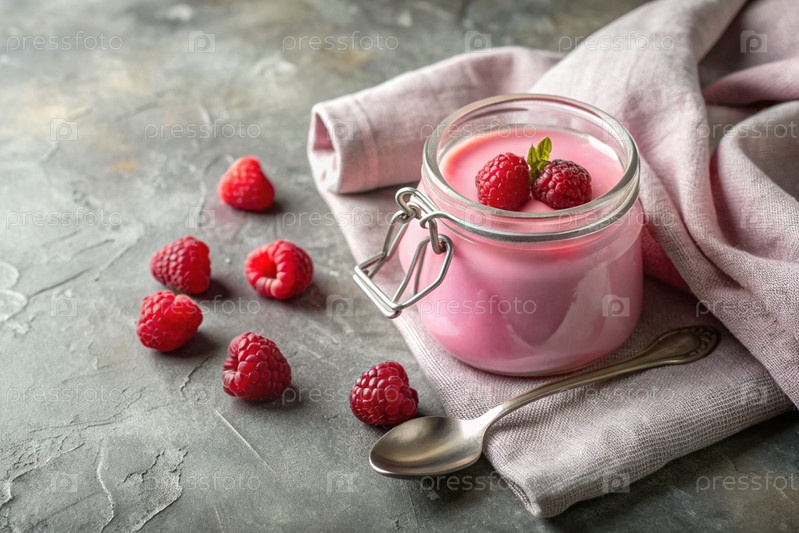 Здоровый, здоровый завтрак. Домашний малиновый йогурт со свежей малиной, винтажная ложка и полотенце на стильном сером фоне