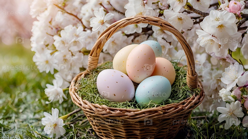 Концепция яркого пасхального праздника. Красивый фон с пасхальными яйцами в плетеной корзине и весенними цветами вишни