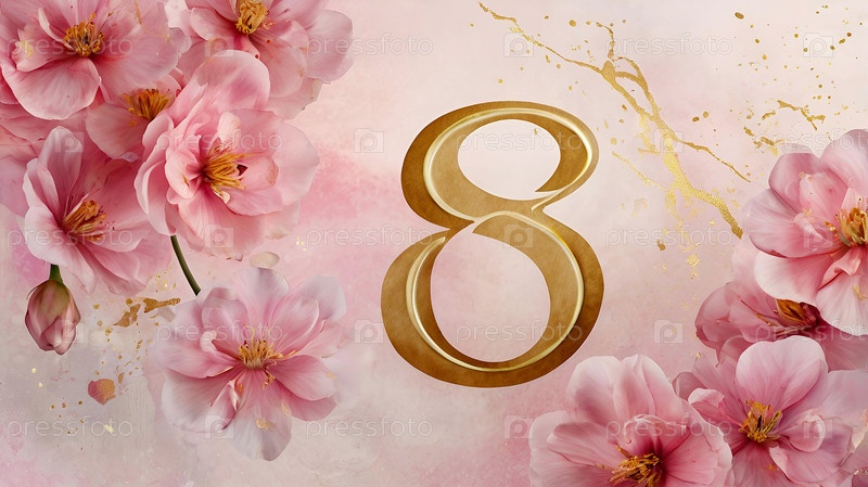 Международный женский день. Праздник приходится на 8 марта. Баннер, флаер. Праздничный, нежный розовый цветочный фон с номером 8