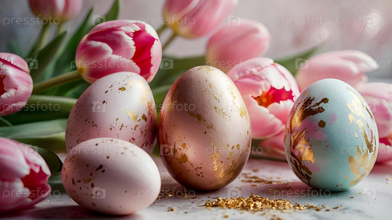 Концепция яркого пасхального праздника. Нежные пасхальные яйца в розовых, золотых и фиолетовых тонах и цветы тюльпанов на пастельном акварельном фоне с нежными венами