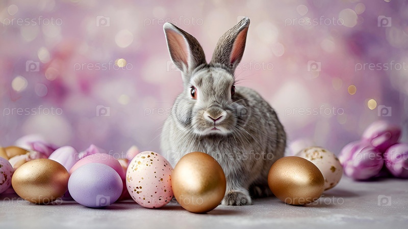 Концепция яркого пасхального праздника. Нежные пасхальные яйца, серый кролик и цветы тюльпанов на пастельном акварельном фоне с нежными венами