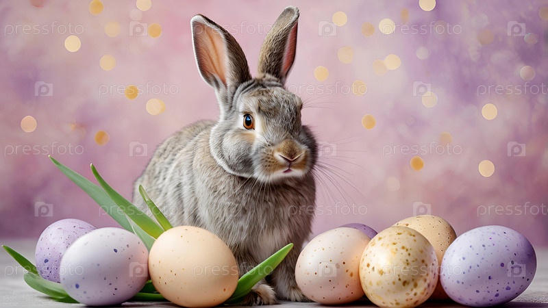 Концепция яркого пасхального праздника. Нежные пасхальные яйца, серый кролик и цветы тюльпанов на пастельном акварельном фоне с нежными венами