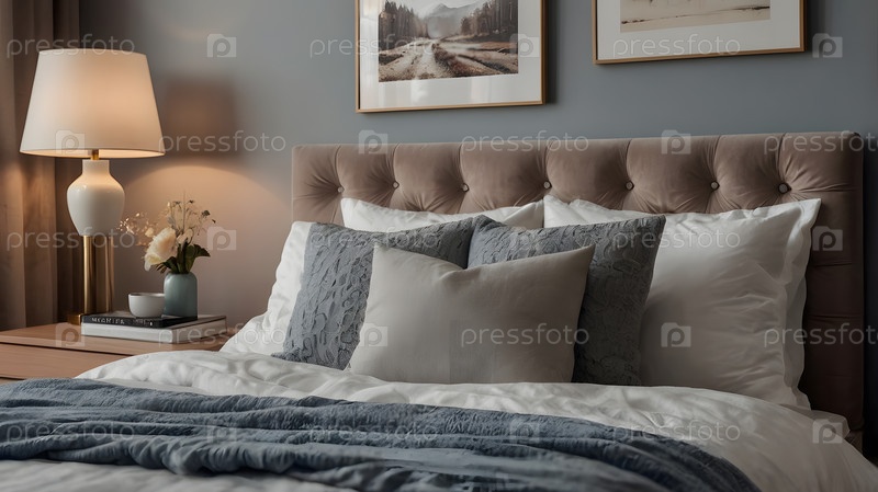 Интерьер современного дома. Минималистичный уютный интерьер спальни с изголовьем, постельным бельем, подушками и прикроватным столом