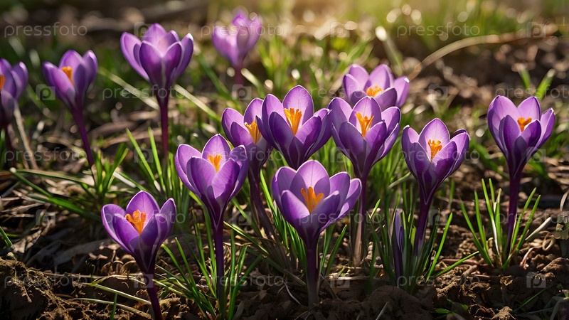 Первые весенние цветы. Фиолетовые крокузы (лат. Crocus) крупным планом при утреннем солнечном свете