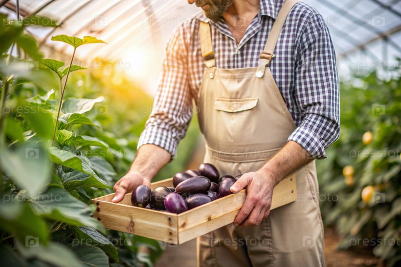 Сельскохозяйственная промышленность. Деревянный ящик с баклажанами в руках фермера-мужчины. Садовник собирает богатый урожай в теплице