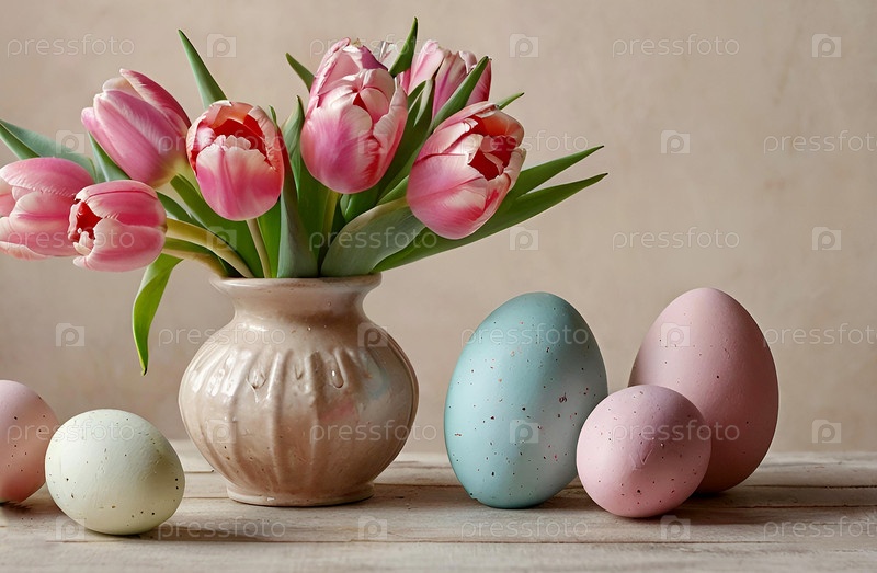 Букет тюльпанов и нежных пасхальных яиц на столе. Красивая пасхальная открытка. Понятие минимализма