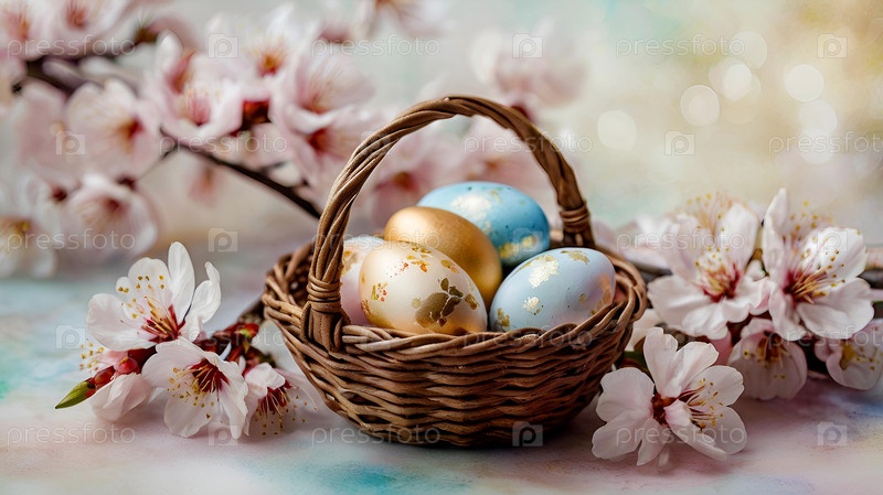 Концепция яркого пасхального праздника. Нежные пасхальные яйца и вишневые ветви цветут на пастельном акварельном фоне с нежными прожилками