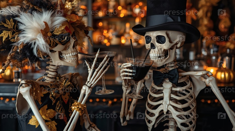 Пара любителей скелетов с коктейлями в баре. Вечеринка в честь Хэллоуина или Дня мертвых