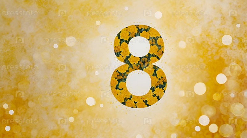 Международный женский день. Праздник приходится на 8 марта. Баннер, флаер. Праздничный желтый цветочный фон с номером 8