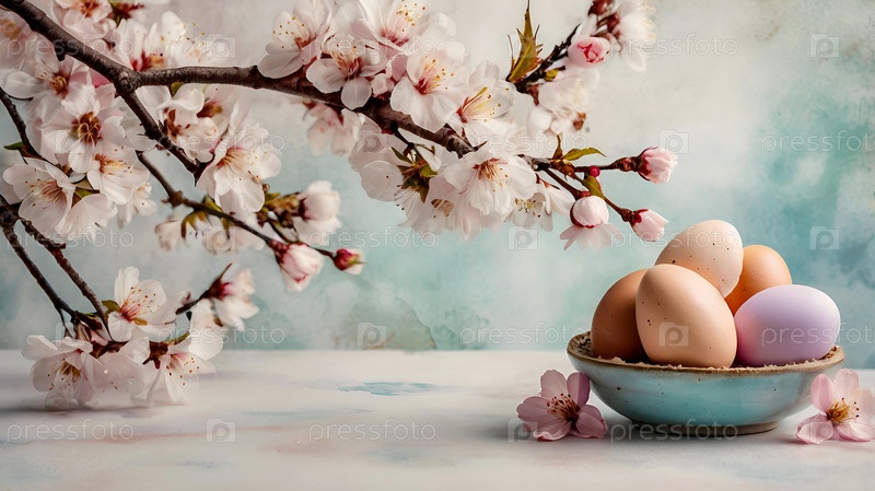 Концепция яркого пасхального праздника. Нежные пасхальные яйца и вишневые ветви цветут на пастельном акварельном фоне с нежными прожилками