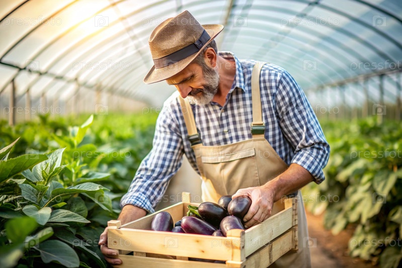 Сельскохозяйственная промышленность. Деревянный ящик с баклажанами в руках фермера-мужчины. Садовник собирает богатый урожай в теплице