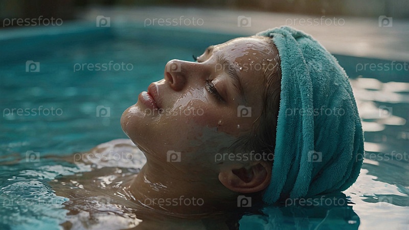 Близко. Молодая красивая женщина в бирюзовом бассейне. Концепция здорового образа жизни, релаксации, релаксации, туризма, косметических спа-процедур в спа-салоне красоты, самолюбия