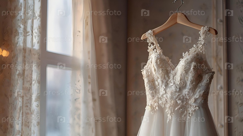 Близко. Элегантное белое свадебное платье на вешалке и букет цветов. Утро невесты. Аренда и покупка свадебных платьев для проведения мероприятий