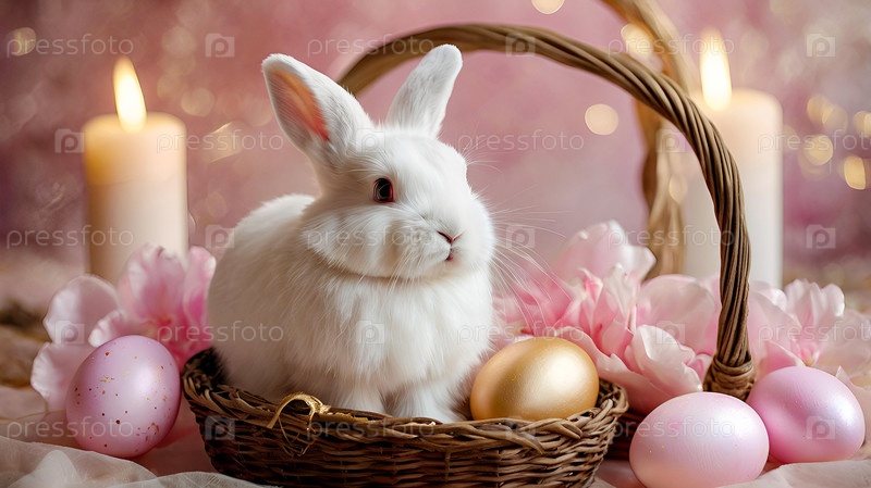 Концепция яркого пасхального праздника. Нежные пасхальные яйца, кролик и нежные цветы на пастельном акварельном фоне с нежными венами