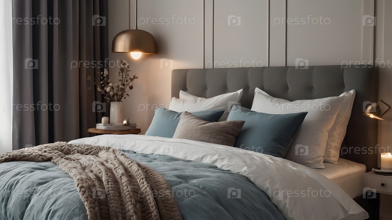 Интерьер современного дома. Минималистичный уютный интерьер спальни с изголовьем, постельным бельем, подушками и прикроватным столом