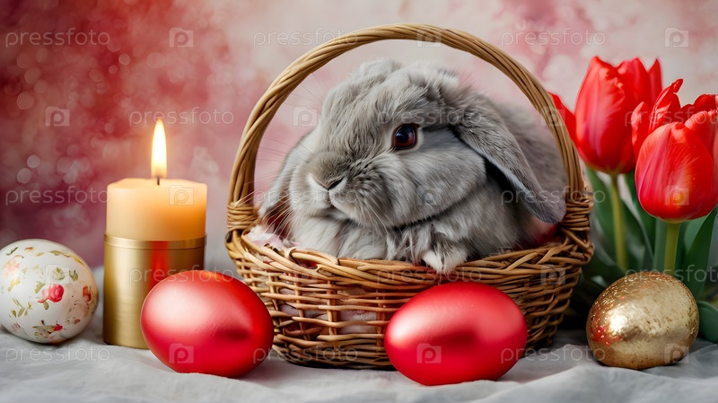 Концепция яркого пасхального праздника. Яркие пасхальные яйца в плетеной корзине, кролик и ярко-красные цветы на пастельно-водяном фоне