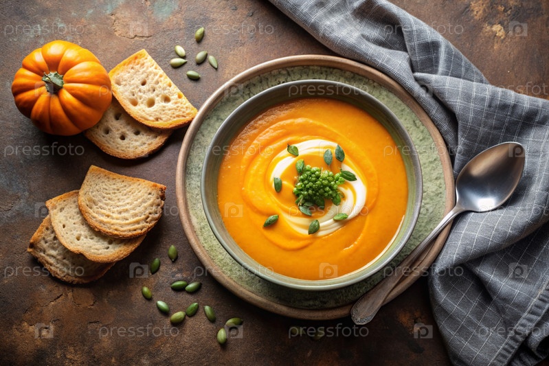 Сезонное осеннее блюдо. Традиционный нежный суп из тыквенного супа с сливками и семенами тыквы на коричневом бежевом фоне