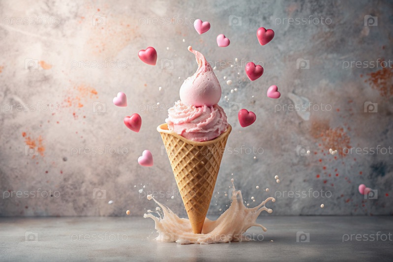 Сладкий десерт. Любовь к мороженому. Конус мороженого в форме сердца с брызгами, сердцами и брызгами. Концепция Дня святого Валентина. Баннер, реклама