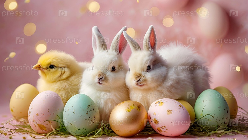 Концепция яркого пасхального праздника. Нежные пасхальные яйца, кролики и куры на пастельном фоне