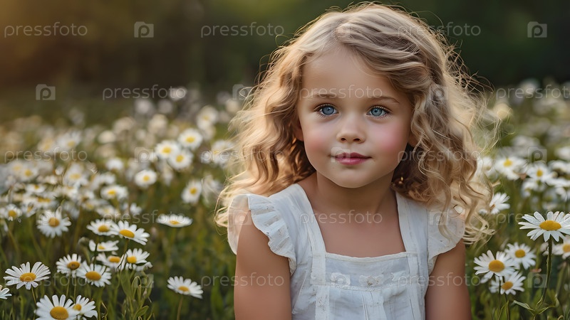 Всероссийский день семьи, любви, верности. Красивая маленькая кудрявая девочка на фоне поля ромашек. День Святого Валентина Петра и Февронии