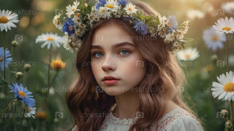Красивая девушка с венком из ромашек и кукурузных цветов на голове в поле. День святых Петра и Февронии. Всероссийский день семьи, любви, верности