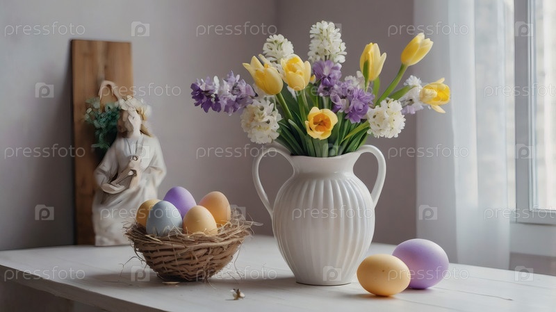 Концепция яркого пасхального праздника. Ретро интерьер дома с пасхальным декором. Весенние цветы в белой вазе и пасхальные яйца в пастельных оттенках