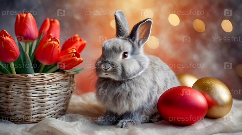 Концепция яркого пасхального праздника. Яркие пасхальные яйца в плетеной корзине, кролик и ярко-красные цветы на пастельно-водяном фоне