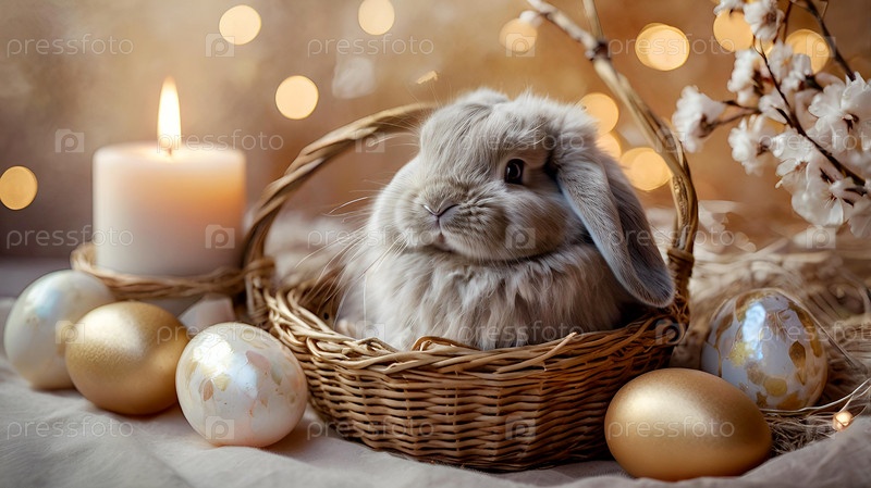 Концепция яркого пасхального праздника. Нежные пасхальные перламутровые яйца в корзине, кролик и нежные цветы на пастельном акварельном фоне