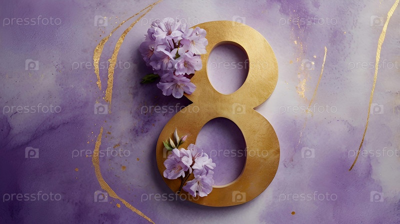 Международный женский день. Праздник приходится на 8 марта. Баннер, флаер. Праздничный, нежный фиолетовый цветочный фон с номером 8