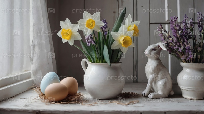 Концепция яркого пасхального праздника. Ретро интерьер дома с пасхальным декором. Весенние цветы в белой вазе, кролик и пасхальные яйца в пастельных оттенках