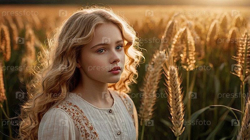 Теплый портрет красивой кудрявой женщины на пшеничном поле на закате. Романтическая, спокойная и чувственная фотография девушки в нежном платье