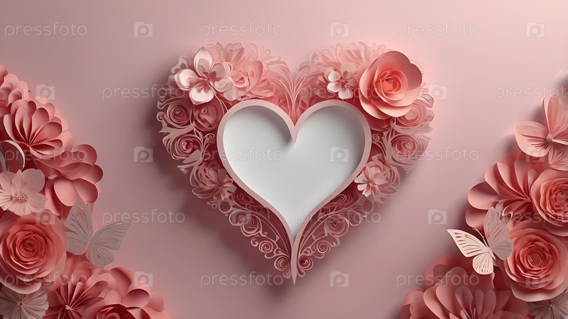Концепция Дня святого Валентина с розовым сердцем, изображающим Любовь. Стильный дизайн бумажных срезанных цветов. Место для копирования