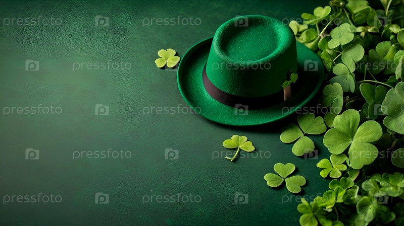 День Святого Патрика, 17 марта. Зеленый фон с листьями клевера и шапкой лепрекона. Копия плоского пространства