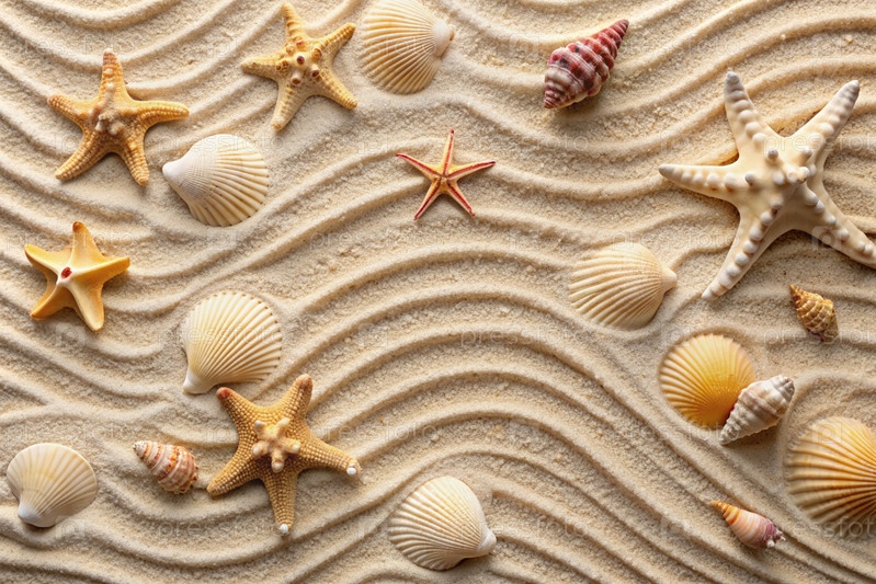 Концепция морского отдыха. Оболочки на песке. Предыстория летних каникул. Копия расположения текста. Вид сверху