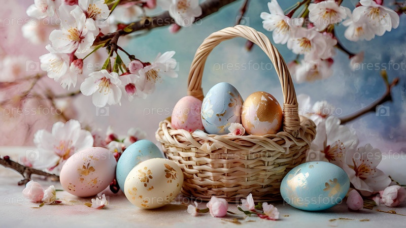 Концепция яркого пасхального праздника. Нежные пасхальные яйца и вишневые ветви цветут на пастельном акварельном фоне с нежными прожилками