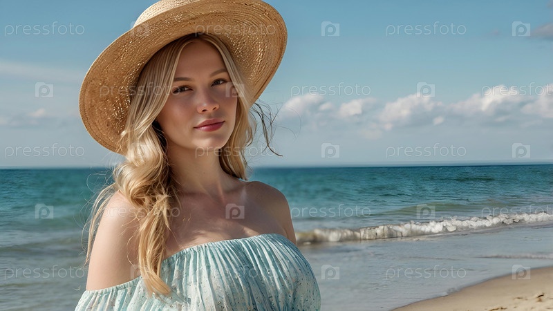 Летний отдых на пляже, крупный план красивой женщины в соломенной шляпе. Летнее время. Отдых и каникулы, место для копирования