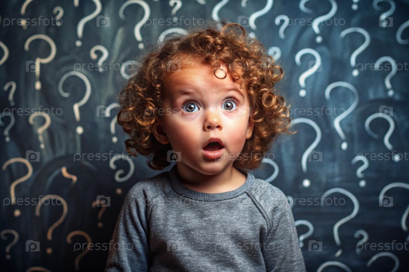 Развитие и воспитание детей. Удивленный мальчик на темном фоне с вопросительными знаками. Мозговой штурм, детские вопросы и концепция идеи