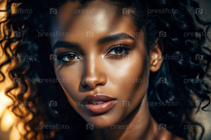 Красивый портрет естественной чернокожей девушки афроамериканской модели на нейтральном оранжевом фоне с контрастным освещением и тенями Косметология, уход за кожей, уход за лицом и макияж