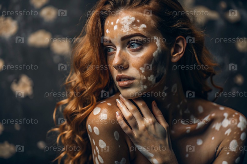 Лейкодерма. Витилиго. Нарушение пигментации кожи. Большие белые пятна по всему телу и лицу. Портрет красивой девушки с кожной болезнью