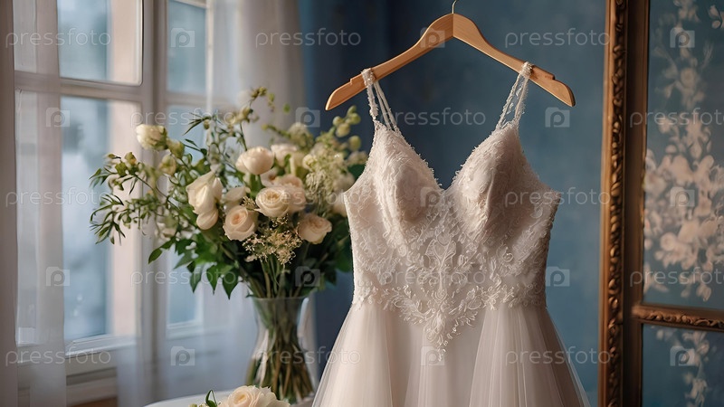 Близко. Элегантное белое свадебное платье на вешалке и букет цветов. Утро невесты. Аренда и покупка свадебных платьев для проведения мероприятий