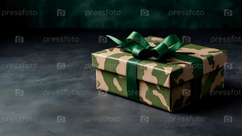 Концепция Дня защитника Отечества 23 февраля. Подарок камуфляжной коробки с праздничным атласным ленточным луком на темно-зеленом фоне