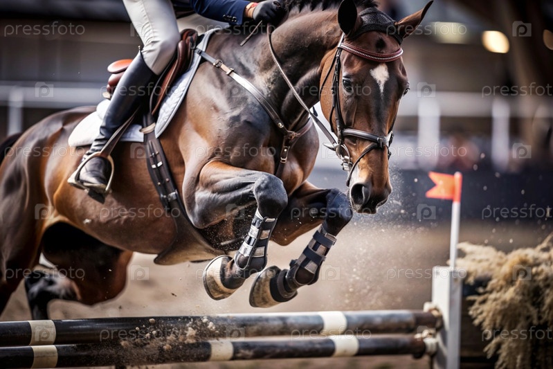 Крупный план олимпийской лошади и всадника, перепрыгивающего через препятствие на открытой арене, конный спорт. Концепция летних Олимпийских игр