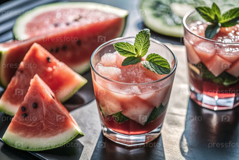 Свежий вкусный арбузный лимонад, мята, кубики льда и кусочки арбуза. Летний освежающий напиток